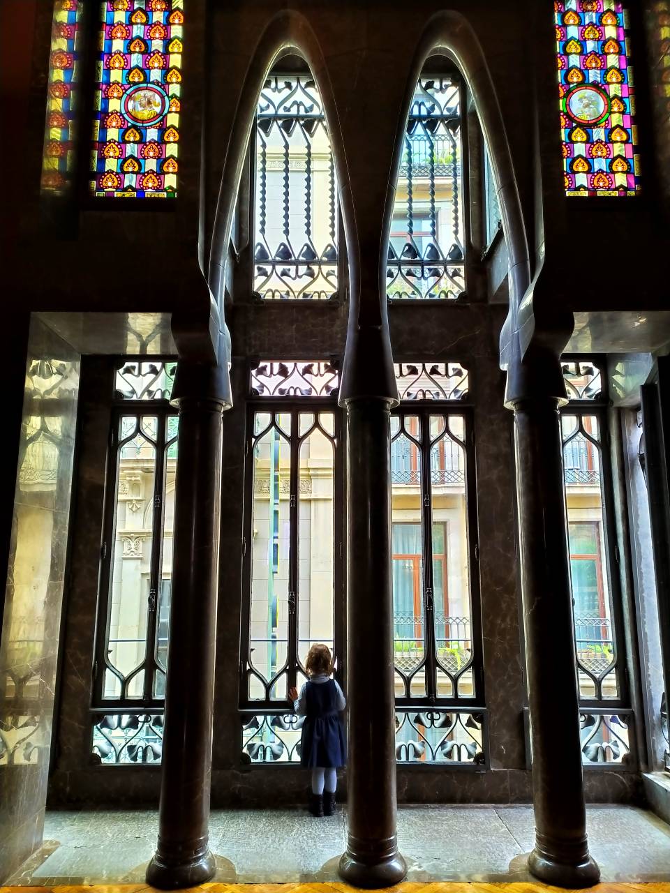 Detalle de los soportes estructurales, con capiteles que parecen derivar de unos califales, y los vitrales con sendas franjas de motivos bulbosos abajo y arriba. Otros ventanales del palacio se hacen con una composición de piezas irregulares similares a los muros campesinos de mampostería, unas formas que volverá a usar en las rejas de hierro de las puertas de la Casa Milà y serán un precedente monocolor del trencadís multicolor de futuras obras de Gaudí y su ayudante Jujol.