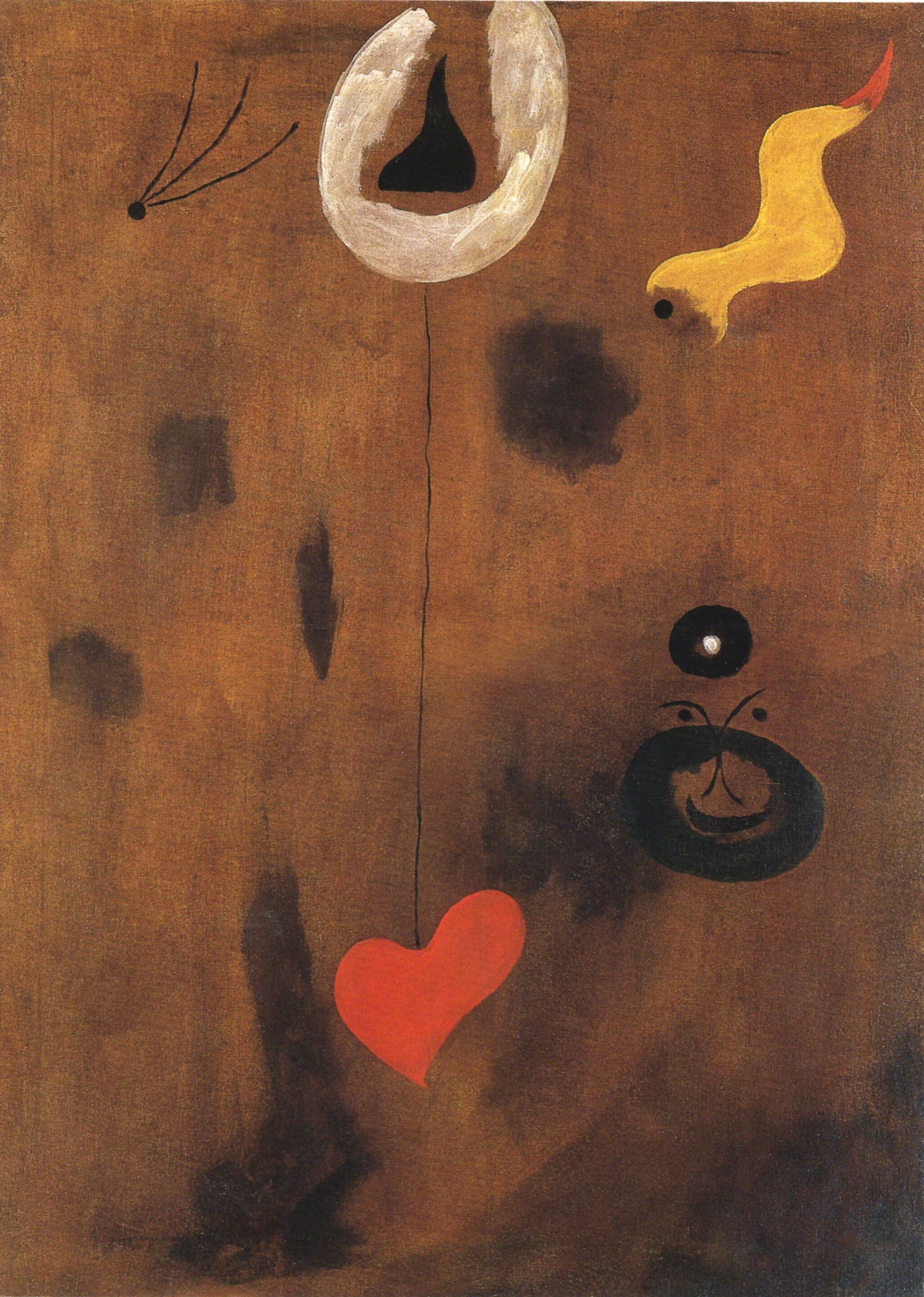 Art Museum, sito en la Washington University, Saint Louis, donación de Mr. & Mrs. Richard. K. Weil, 1963, antes col. Jacques Doucet, París; Hector Brame, París. [CRP 158, con rectificación final.] Está relacionado fielmente con un dibujo previo[3], en el que no introduce cambios, y parece un desarrollo inmediatamente posterior de Pintura (1925) [CRP 156], con la idea de una llama- corazón roja (¿la semilla de un amor?) o unos labios muy rojos y estilizados de los que parte una línea vertical (¿un palo para hacer juegos malabares?) que divide el cuadro en dos mitades: a la derecha el mismo personaje con bigote (aunque ahora negro) de la Pintura (Composición) (1925) [CRP 157], y a la izquierda dos elementos novedosos, una línea zigzagueante y la palabra “joi”, que parece simplemente un corte abrupto de la palabra “jou”, que aparece en otra pintura coetánea, Pintura (Mujer, periódico, perro) (1925) [CRP 120], en cuya derecha hay un recuadro blanco con estas “JOU”, en lo que sería una insistencia en la ironía sobre el sentido de un medio diario, un medio juego dadaísta.